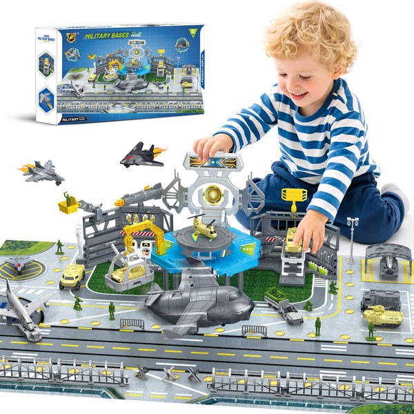 Military Base Toy, Army Toys Set with 14 Vehicles Airplane Tank Trucks Helicopter Fighter Jet, Play Mat with Army Men Action Figures and Accessories, Birthday Gift for Kids