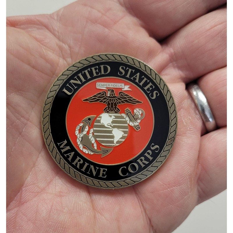 - Beautiful US Marine Corps Challenge Coin with US Marine Corps Emblem on one side and the Marine Squadron Logo on the other side.