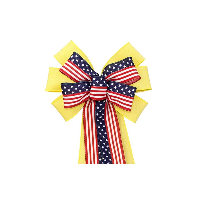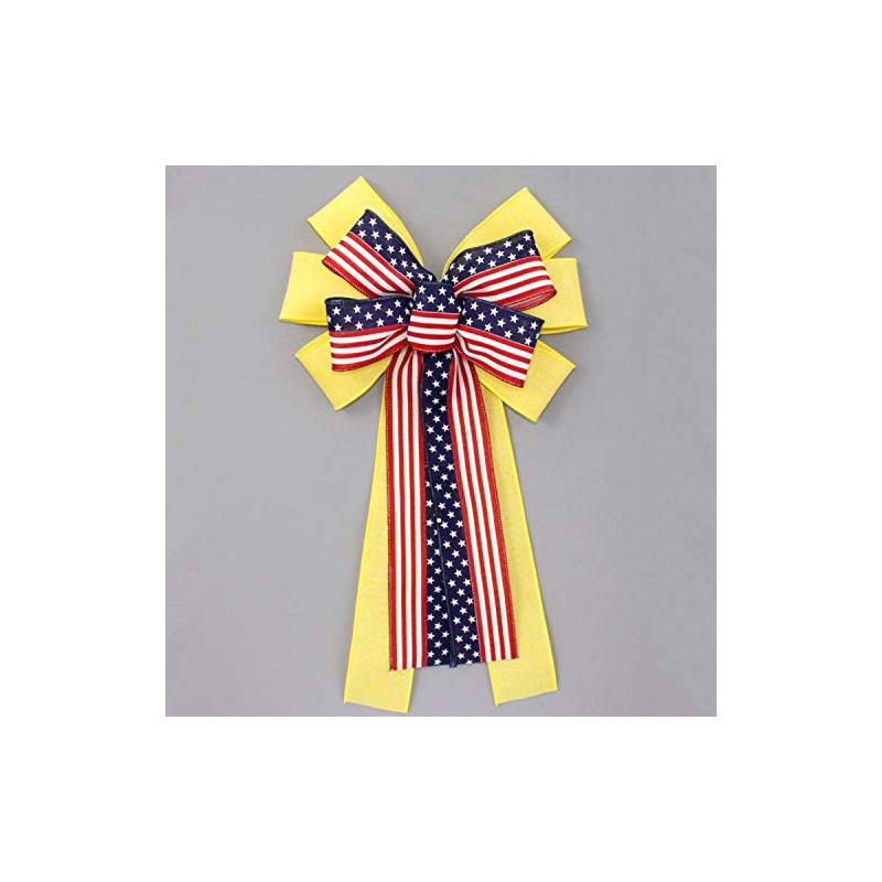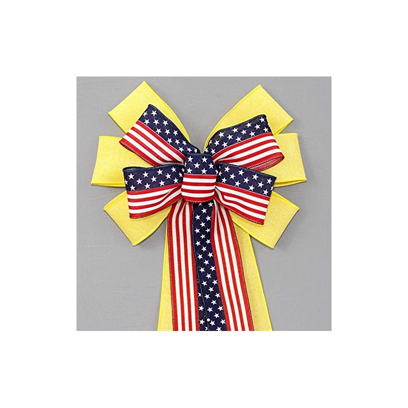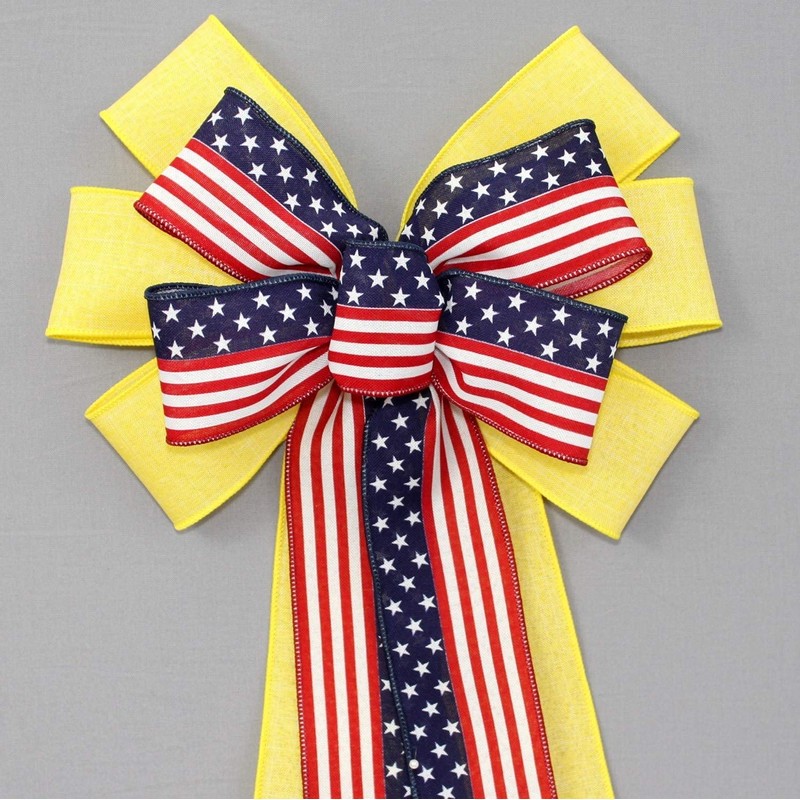 This yellow and flag patriotic wreath bow is created with a ribbon combination to show your support for our military troops and loved ones. It's the perfect bow to accent front door wreaths and front door décor.