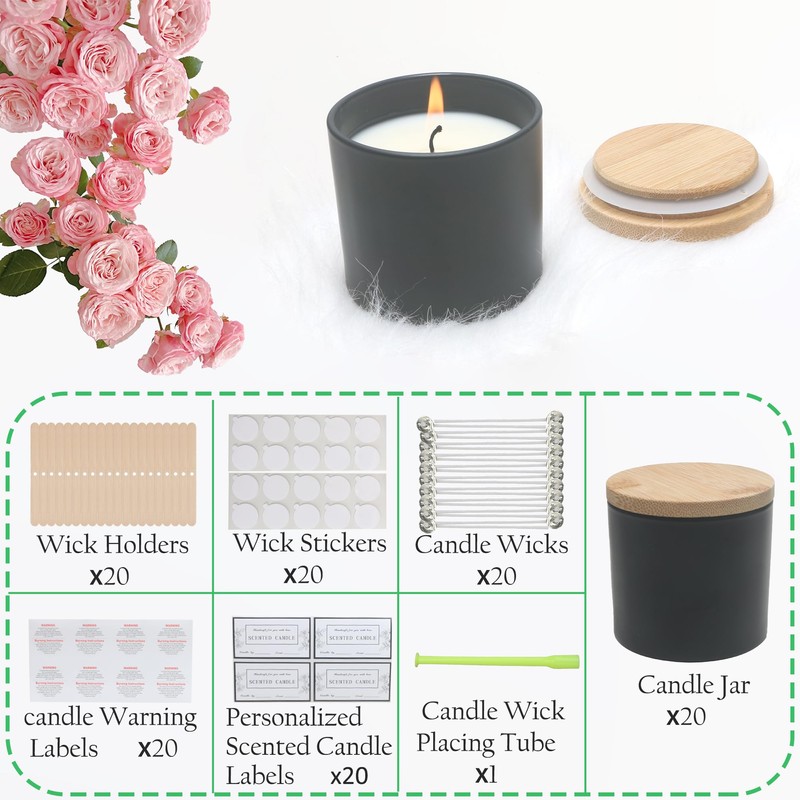 - ▶️ Buy it and you will get: 20pcs matte black glass jars with airtight bamboo lids, 20pcs 3.5inch candle wicks, 20pcs candle wick stickers, 20pcs wick holders, 20pcs candle warning labels, 1pc candle wick placing tubes, 20pcs personalized scented candle labels providing a great individualized area to write the fragrance you emplaced and your name. making your candle making process more convenient and easier. a great value buy!