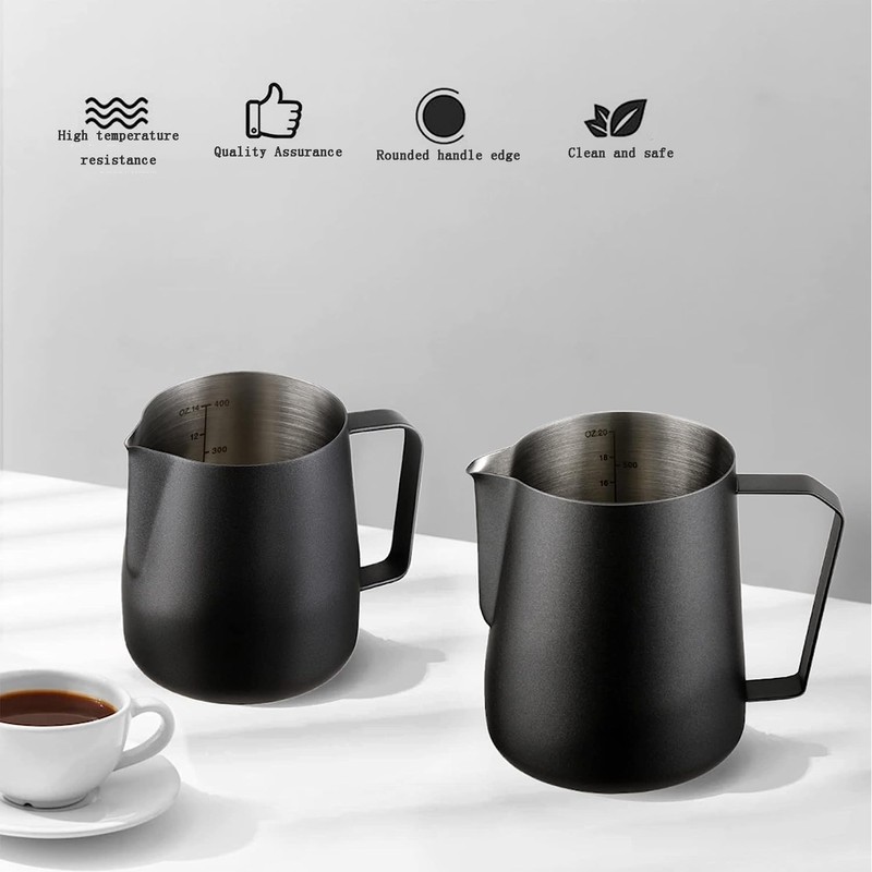 Milk Frothing Pitcher 20oz/600ml, Stainless Steel Espresso Steaming Pitcher Milk Jug, Perfect for Milk, Cream, Water, Juices, Smoothies (Black 600ML)