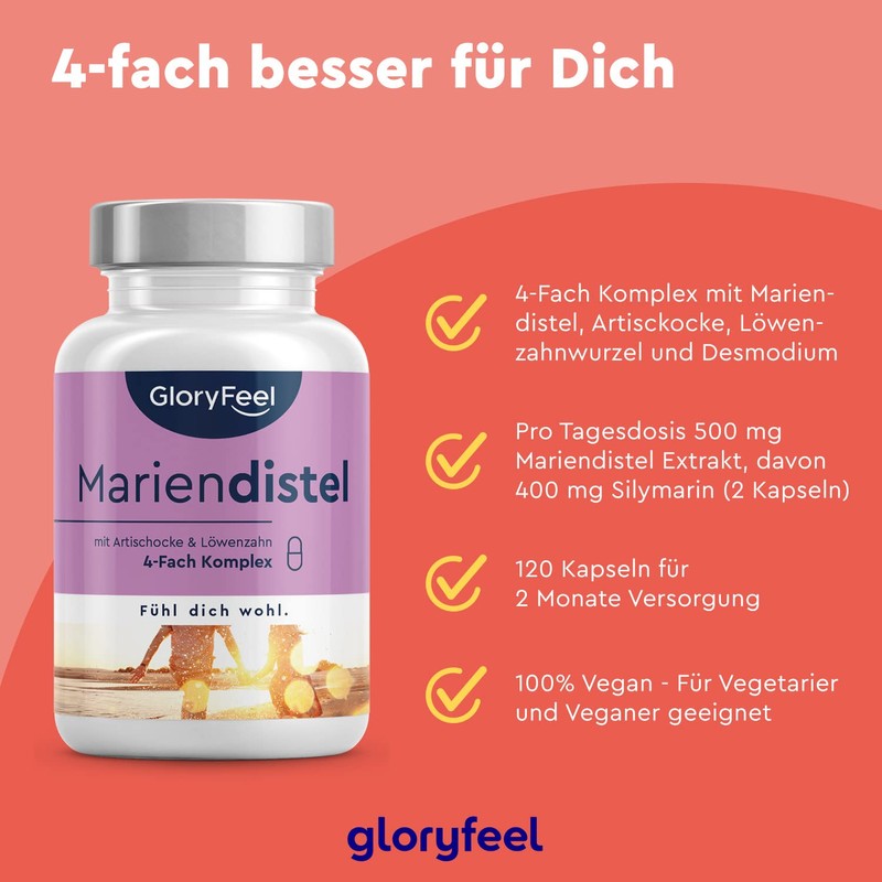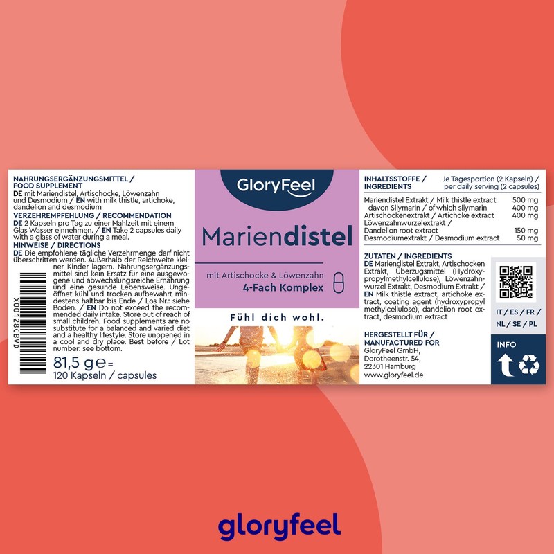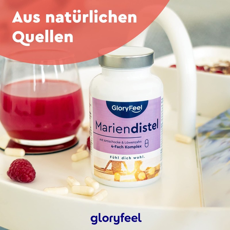 - Brand quality, made in Germany – Manufactured under the highest quality standards and the most stringent quality controls in Germany, every GloryFeel product is subject to continuous tests by accredited testing laboratories. We will be happy to send you the test reports (English not guaranteed). Includes e-book (English not guaranteed) - In addition, you will receive the e-book with lots of background information about our complex of Milk Thistle, Silymarin, Artichoke, Dandelion and Desmodium. –