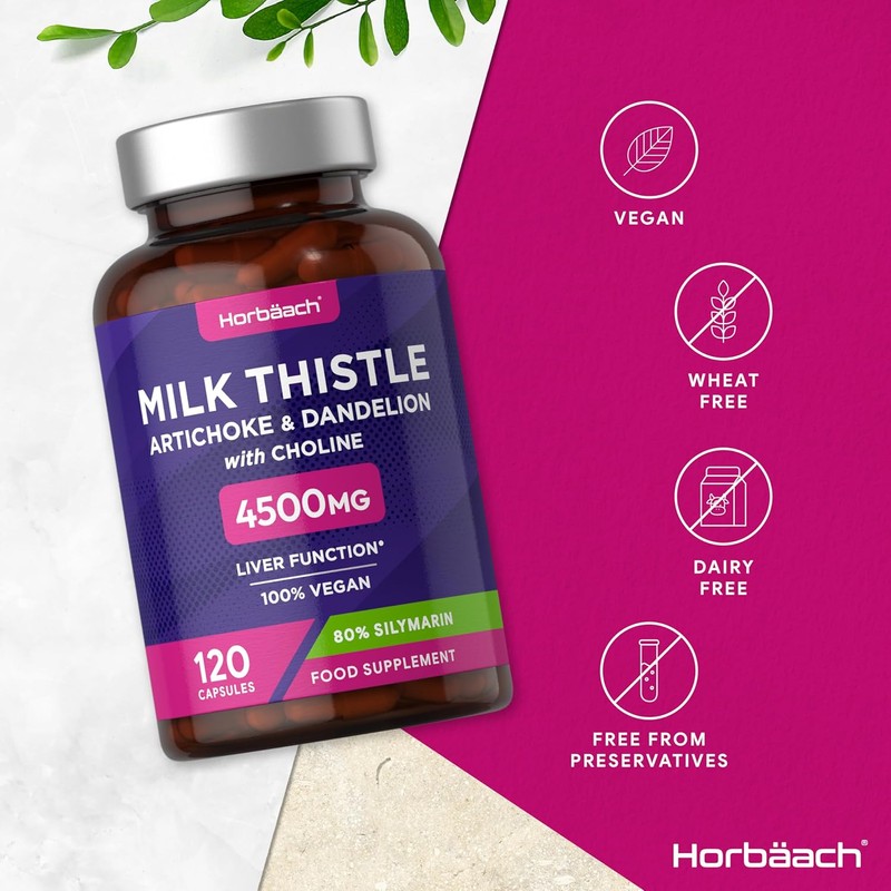 Milk Thistle Capsules 4500mg | 3-in-1 Complex with Artichoke, Dandelion and Choline | 80% Silymarin | High Strength Vegan Supplement | 120 Capsules | by Horbaach