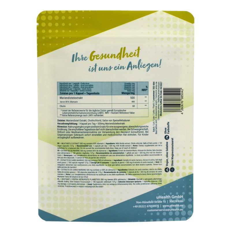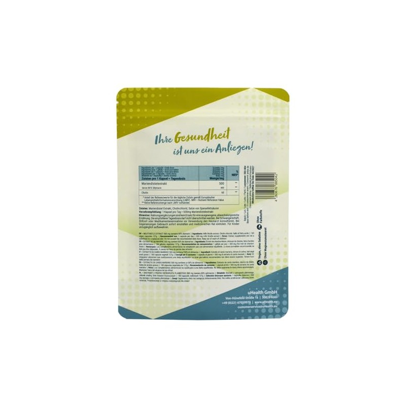 - Milk thistle extract 500 mg; contains 80% silymarin in vegetable capsules; with choline