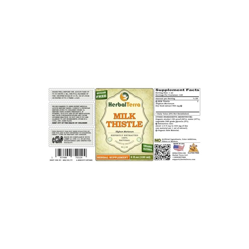 Milk Thistle (Silybum Marianum) Tincture, Organic Dried Seeds Liquid Extract (Brand Name: HerbalTerra, Proudly Made in USA) 4 fl.oz (120 ml)