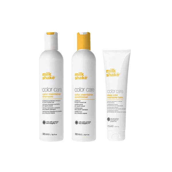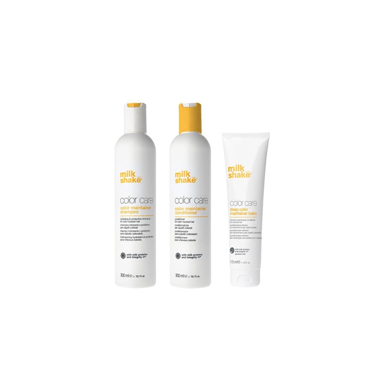 The milk_shake Colour Maintainer Trio Bundle contains a hydrating and protective shampoo, a conditioner, and an intensive maintenance conditioner for colour-treated hair.