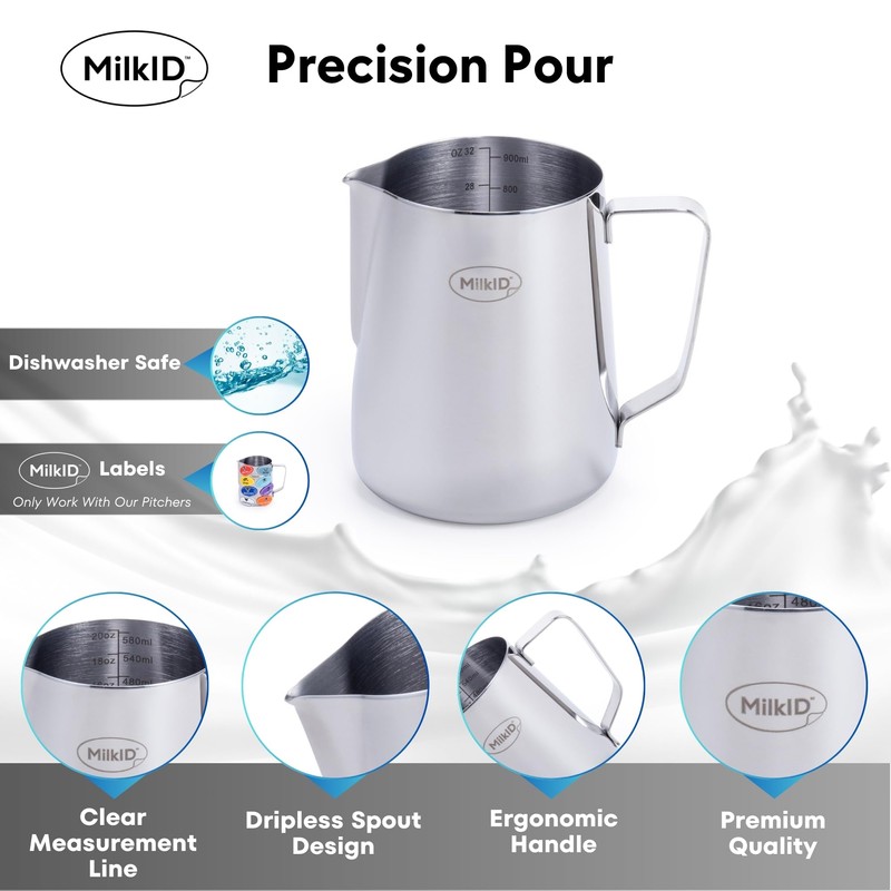 MilkID Milk Frothing Pitcher with 8 Allergen Silicone Snap-On Labels | Must-Have Barista Tool | Coffee Bar Accessories & Espresso Accessories Kit | (32oz / Pitcher + Labels)