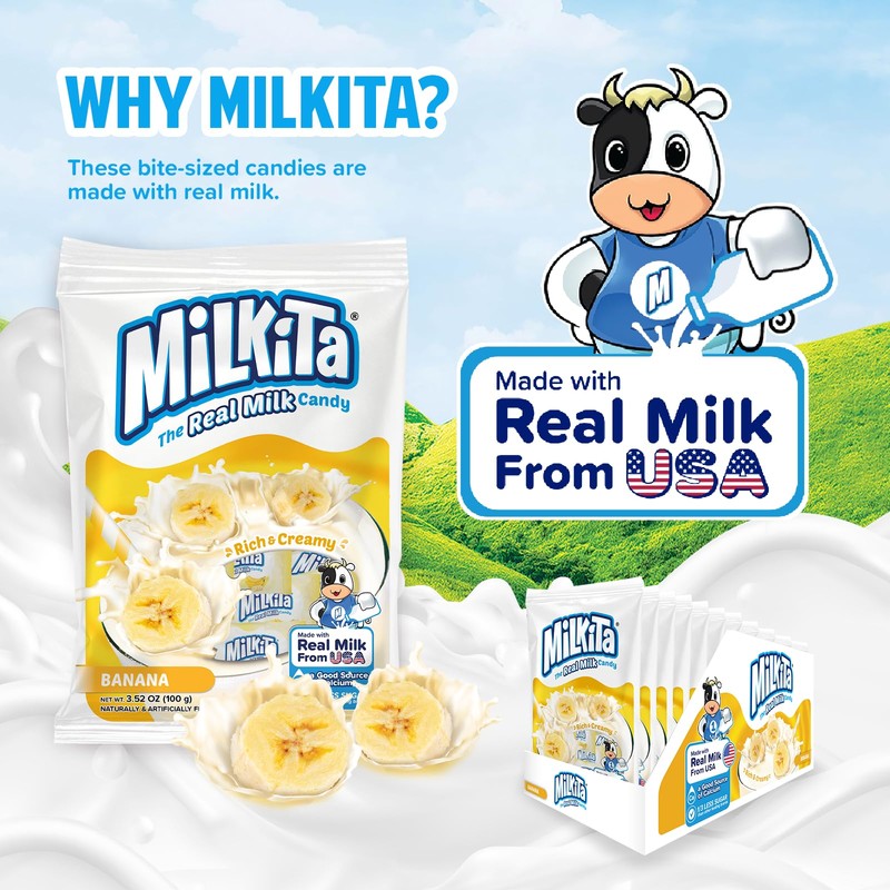 Milkita The Real Milk Candy, Gluten Free Chewy Candies with Calcium & Real Milk, Zero Trans Fat, Low-Sugar, Banana Flavor, 25 Pcs