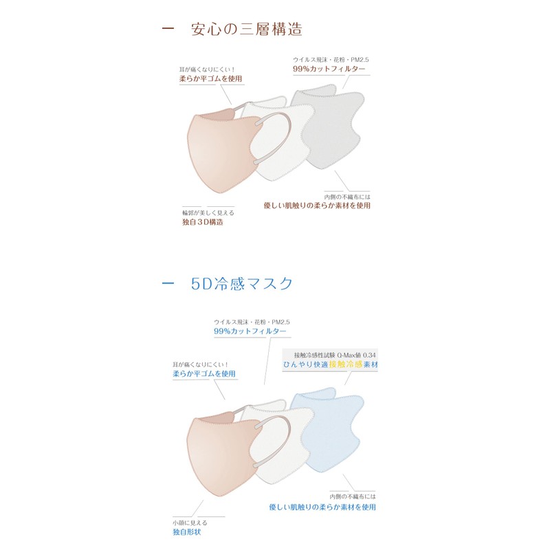- ■カットフィルターを採用した不織布マスク。不織布と不織布の間にメルトブローンを挟んで、BFE:微粒子ろ過効率、99.9%カット。顔にフィットしたフェイスラインを実現。様々なカラー展開で、マスクをファッショナブルに着用できます。