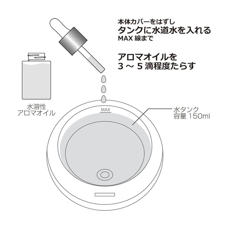- Apply water to a humidifier, aroma diffuser, aroma burner, and a few drops to use. (estimate: about 3 to 5 drops per 16.9 fl oz (500 ml) of water) The scent is soft and spreads into your room
