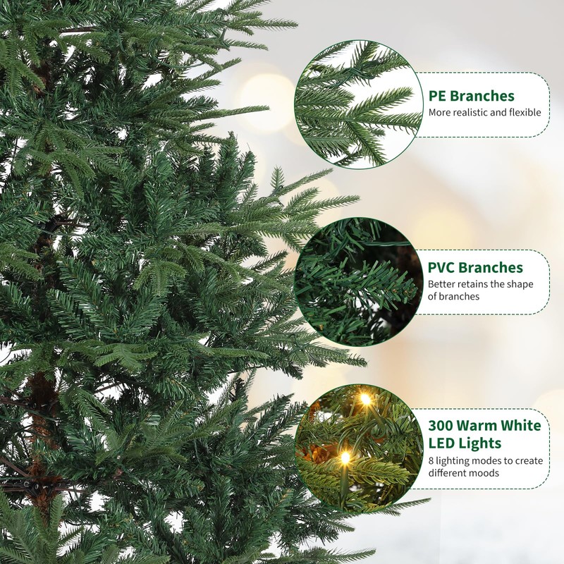 - Convenient Prelit Christmas Tree: As a lighted Christmas tree, it comes pre-adorned with 300 warm white LED lights, eliminating the need for extra lights and saving you time and cost on additional decor. This Christmas tree with lights offers 8 versatile lighting modes and a timer function, allowing you to customize the cozy, inviting glow to perfectly match your holiday mood
