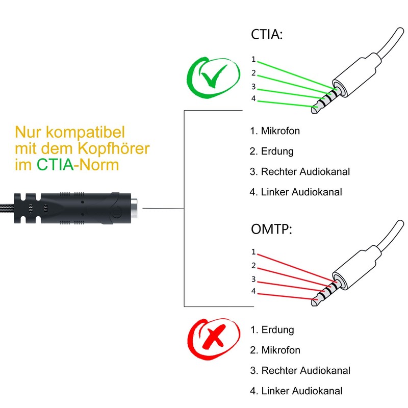 - Suitable for connecting a four-pin gaming headset (does not support Bose or Beats earphones for iOS smartphone) with CTIA standard audio plug (audio & microphone) to a tablet, notebook or PC with separate microphone and audio ports.