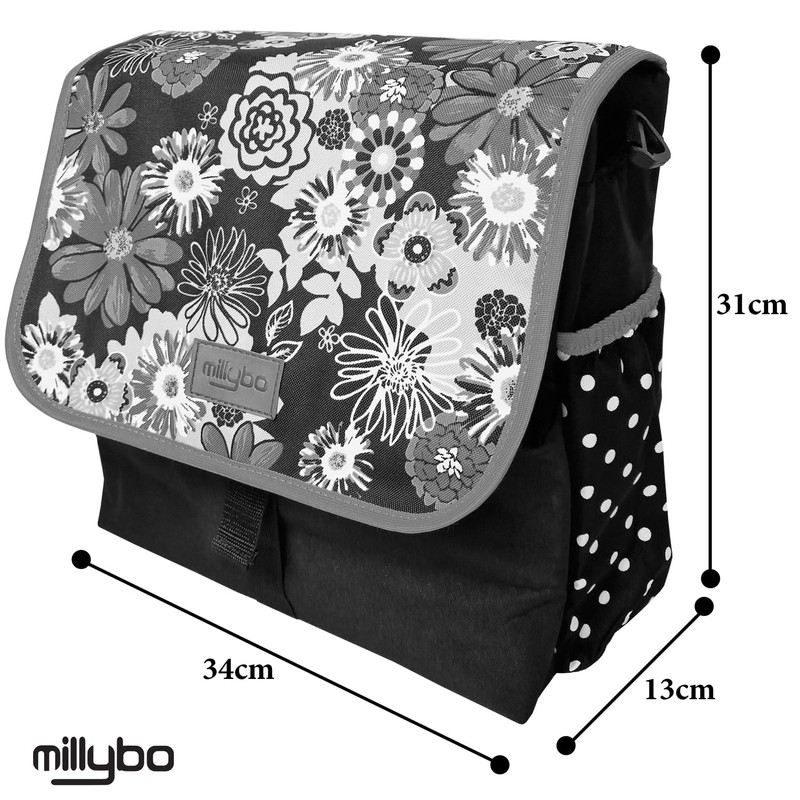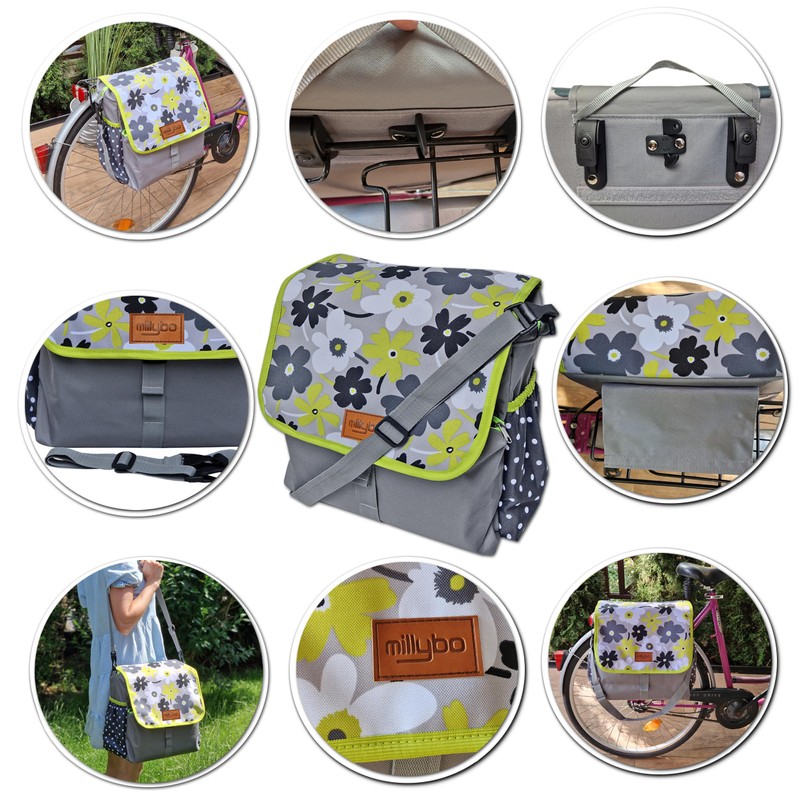 millybo Betsie Single Bicycle Pannier Rack Bag, Bicycle Bag, Many Patterns (110.003 Meadow & Dots Black-Grey)