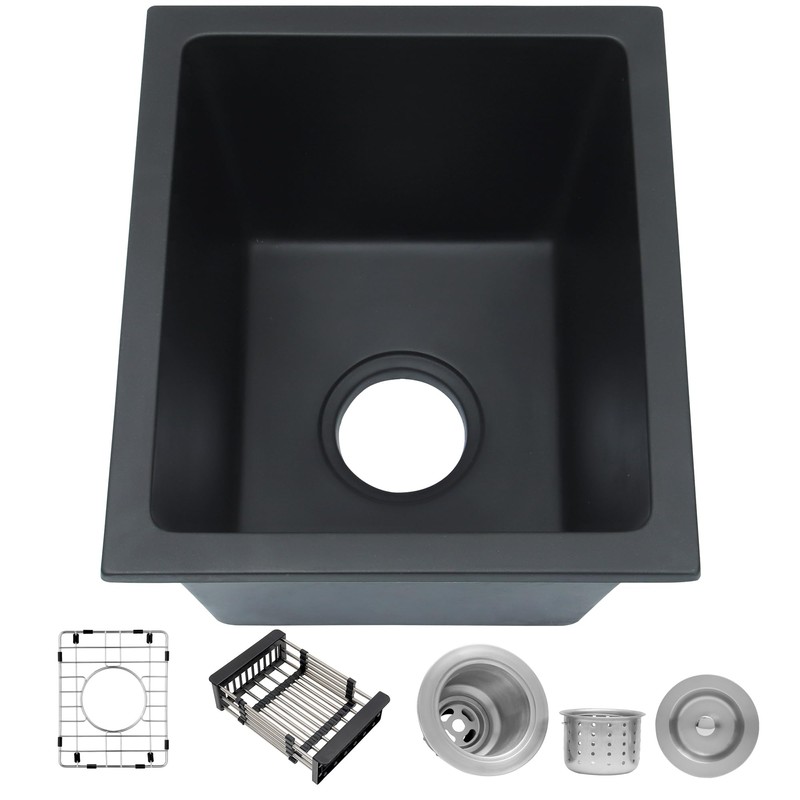 - Quartz Black Kitchen Sink Package Included: 1 Black Bar Sink, 1 Sink Drain Strainer Assembly Set, 1 Sink Bottom Grid, 1 Expandable Dish Drying Rack