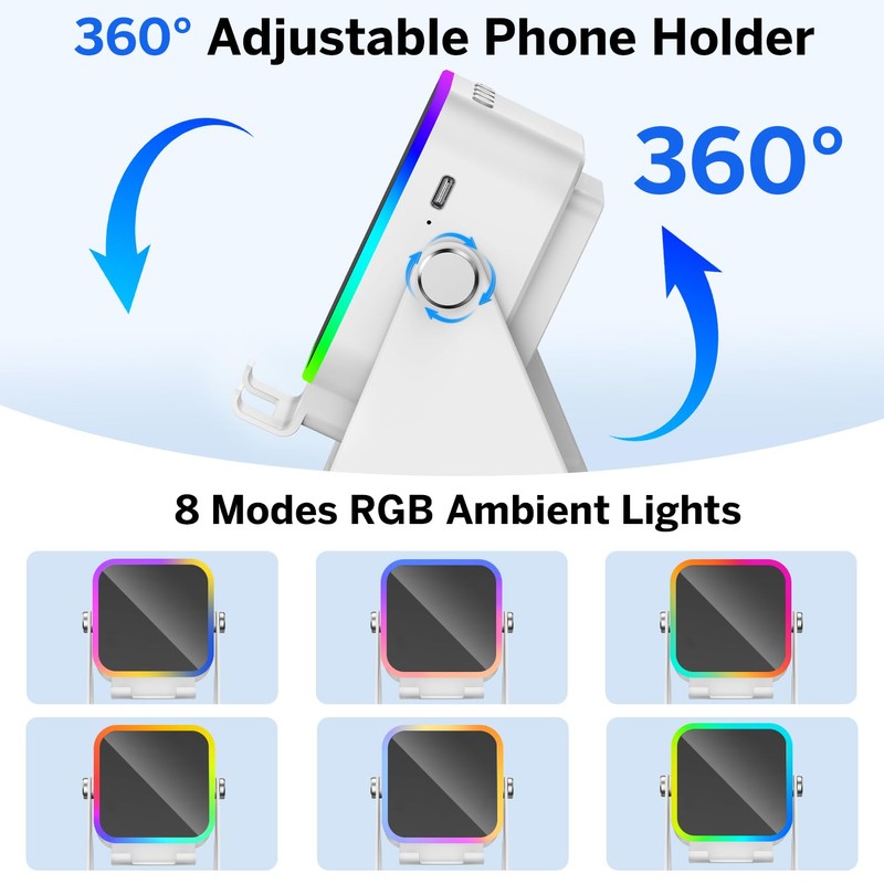 MILOUZ Wireless Induction Speaker 5-in-1 Bluetooth Speaker with Phone Stand,Stereo Sound, 3500mAh Rechargeable, 8 RGB Ambient Light, 360 Adjustable Holder for iPhone/Android/iPad,Gifts for Men Women (White)