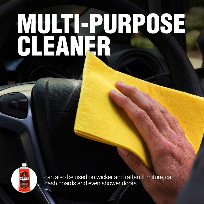 Milsek furniture polish and multi-purpose cleaner is unique because it polishes, cleans and protects your wood in one easy step. Slightly dampen a soft cloth and apply Milsek to it before wiping down your cabinets. Milsek furniture polish and multi-purpose cleaner will remove the grease and grime and restore your wood to its natural luster. Safe to use - leaves no harmful build-up because there are no damaging waxes or silicones in it. You'll find Milsek furniture polish and multi-purpose cleaner safe to use on all wood products and more including; cabinets, hardwood floors, paneling, wicker and rattan furniture, car dash boards, shower doors and fine furniture to remove scratch marks and water/heat rings. Pack of 12 12-Ounce bottles included.