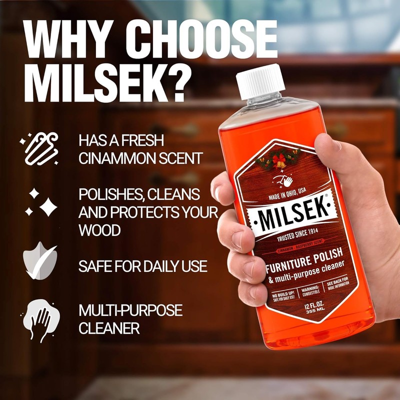 - Triple Action Care: Milsek Furniture Polish and Wood Cleaner with Cinnamon Raspberry Scent not only cleans but also polishes and protects your wood surfaces, leaving them with a radiant shine and long-lasting protection against daily wear and tear.