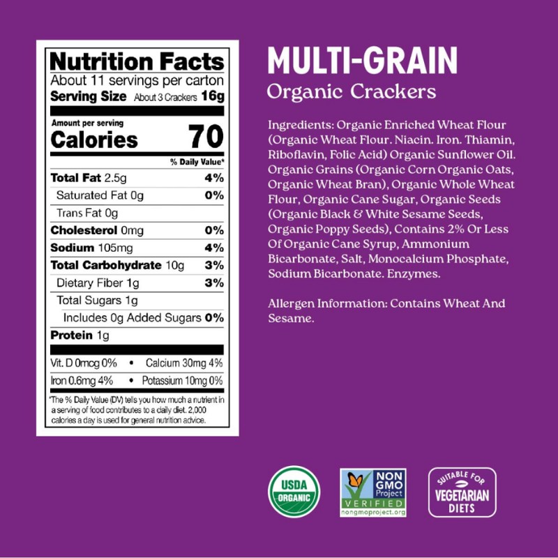 STEP UP YOUR CHARCUTERIE GAME - Milton's Organic Multi-Grain Crackers are distinctively savory yet slightly sweet and baked to light, crispy perfection. They're simple, satisfying, and deliciously organic. MADE FROM PREMIUM INGREDIENTS - Milton's Organic Crackers are made from premium, wholesome ingredients that are responsibly sourced and are produced in a facility that does not process tree nuts or peanuts. DELICIOUS YOU CAN FEEL GOOD ABOUT - USDA Certified Organic and Non-GMO Project Verified, these thin and crispy crackers stand out at any occasion. The delicious combination of grains, seeds, and savory seasonings are the perfect pairing for your favorite cheeses, meats, and spreads. YOUR GO TO ENTERTAINING CRACKER - Imagine your go-to entertaining cracker - but better. Milton's Organic Crackers are destined to become your new go-to for every flavorful moment, from picnics to parties, from lunchboxes to late-night snacks. BREAK OUT THE GOOD CRACKERS - It's hard to believe that something as simple as a cracker can change the way you snack and that premium, USDA Certified Organic ingredients can be the life of every party, but it's true! And the delicious proof awaits in every crunch of Milton’s Organic Crackers.