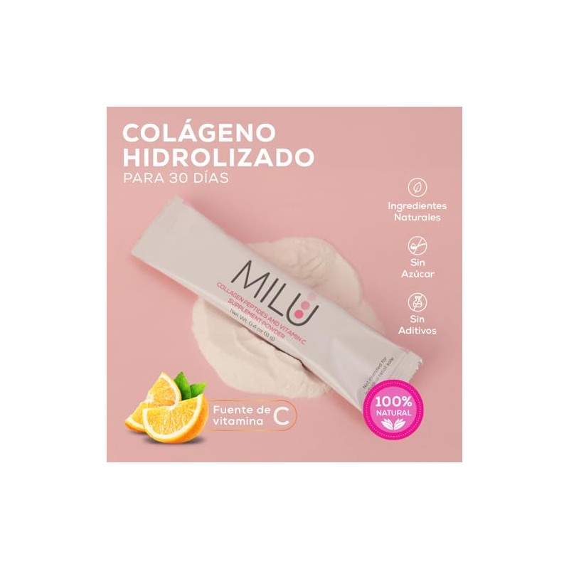 MILU | Colágeno Hidrolizado con Vitamina C | 30 Sobres individuales de 11g (1Caja) | Suplemento Alimenticio Sin Saborizantes - Sin Olor - Sin Azúcar | Péptidos de Colágeno Porcino | Apto para dietas Keto |