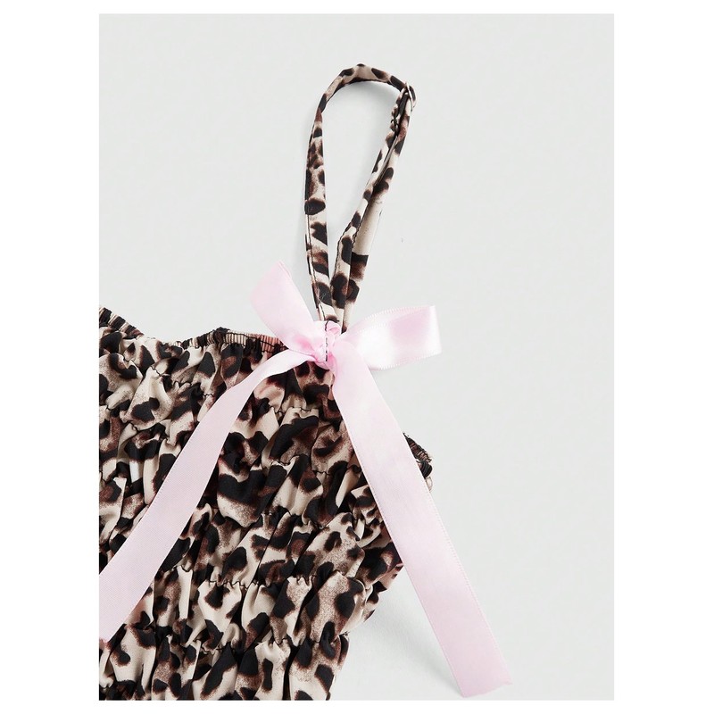 - Feature: Bowknot Decor, Leopard Pattern, Ruched, Smocked, Lettuce Hem, Sleeveless, Square Neck, Slim Fit, Crop Cami for Women