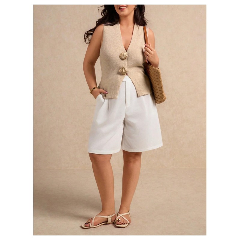 - Feature: Plus Size, Seashell Button, V Neck, Sleeveless, Slit Hem, Rib Knit, Solid, Sweater Vests for Women