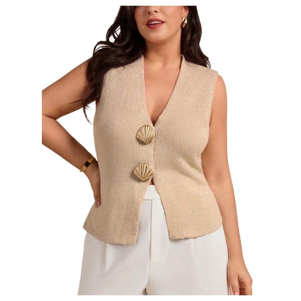 Milumia Women's Plus Size Sweater Vest Meatal Seashell V Neck Knit Tank Top Sleeveless Cardigans Apricot 4X-Large Plus