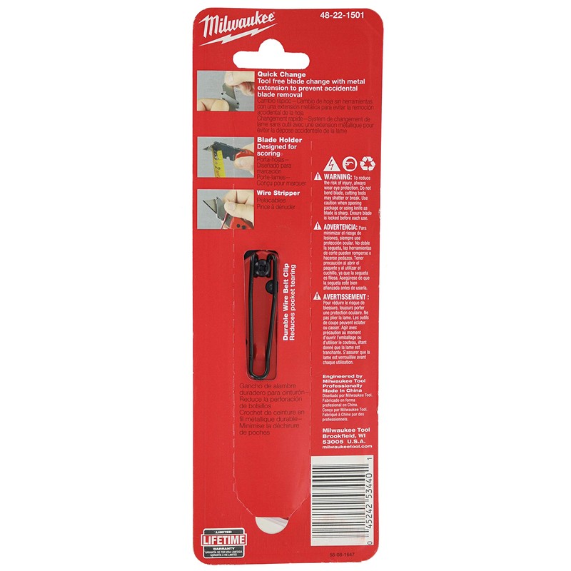 Wherever you go, be it on the job, at home, on the street, or on an outdoor adventure, a utility knife is a lightweight, practical addition to your tool kit. The Milwaukee 48-22-1501 Fastback Utility Knife does many common jobs with ease. Its ergonomic design allows comfortable grip. You can strip wires with the onboard wirestripping tool which works up to the 12 gauge size. You can cut finer materials like string or twine without having to open the blade thanks to the guthook. An on board tape measure blade holder is also featured. Use this to grab the end of a tape measure and score simultaneously. Once your blade has worn down after cutting open boxes, slicing twine, or aiding around the office, you can replace it in a pinch! Simply press down, pull the old blade out, and slide a new blade in without a problem! This knife even has a hole for attaching to lanyards or a wire clip that you can attach to your belt or other articles of clothing so the knife stays on your person. Milwaukee has mastered the art of optimizing utility in the simplest of tools. Take advantage of their constantly innovative design by picking up the 48-22-1501 Fastback knife.