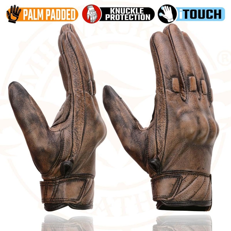 - ✅ Premium Cowhide Leather Riding Gloves | Our specially crafted full-grain brown cowhide leather riding gloves offer premium protection for your hands and fingers. Made from impermeable cow skin, biker gear gloves provide a perfect blend of style and comfort. With their thicker and stronger construction, they are built to withstand tough riding conditions while delivering long-lasting performance. Cowhide leather will continue to soften over time and with use, it retains its durability.