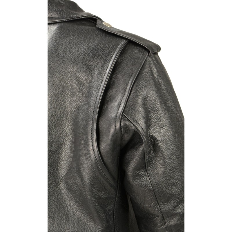- OUTSIDE FEATURES: Front Zipper Closure with Built-In Half Belt for an Easy Adjustment + Snap Down Collar and Shoulder Straps + Action Shoulder Back Panel + Plain Back -Seamless Panel – Perfect for Embroidery or Club Patches + Zipped Cuffs + Silver Color Hardware