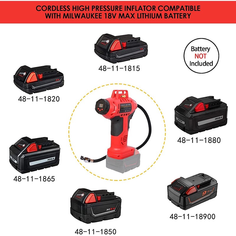 • This portable air compressor is compatible with Milwaukee 18V max Lithium Battery. We sell tools only, NO BATTERY! We provide 12-month warranty and 24 / 7 customer service for the air compressor , so please contact us if you have any question about the product
