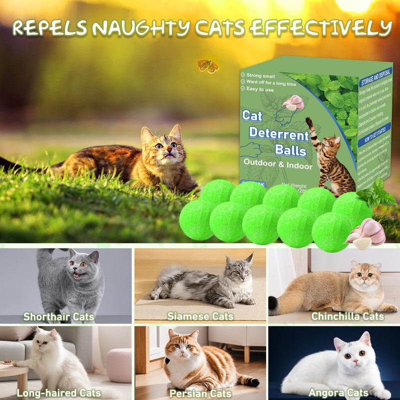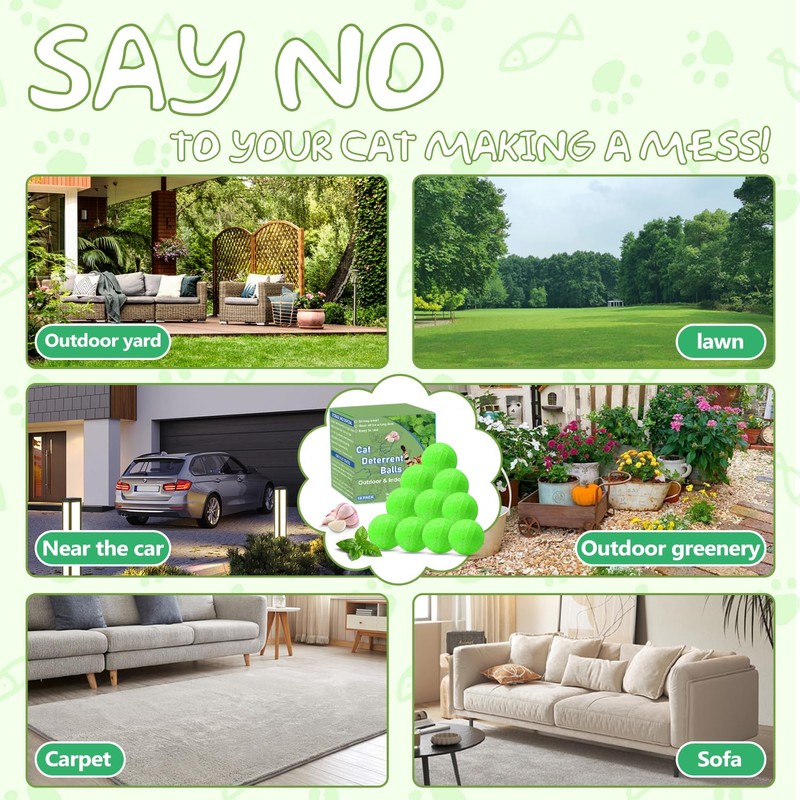 - How to Use: Each package contains 10 cat deterrent balls and 10 mesh bags for hanging. One deterrent cat ball can cover up to 600 square feet, you can put it anywhere you want to set up a no-go zone. Simply place the cat anti balls in the mesh bags and hang them on the railings or place them in the grass to prevent stray cats from invading.