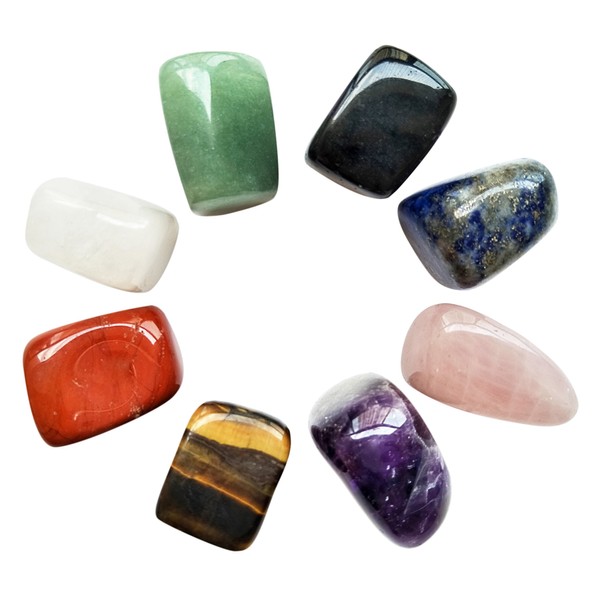 - Set of 8 Chakra Crystal Stones: 1) Aventurine, 2) Rose Quartz, 3) Red Jasper, 4) Tiger Eye, 5) Amethyst, 6) Obsidian, 7) Lapis Lazuli and 8) Clear Quartz.