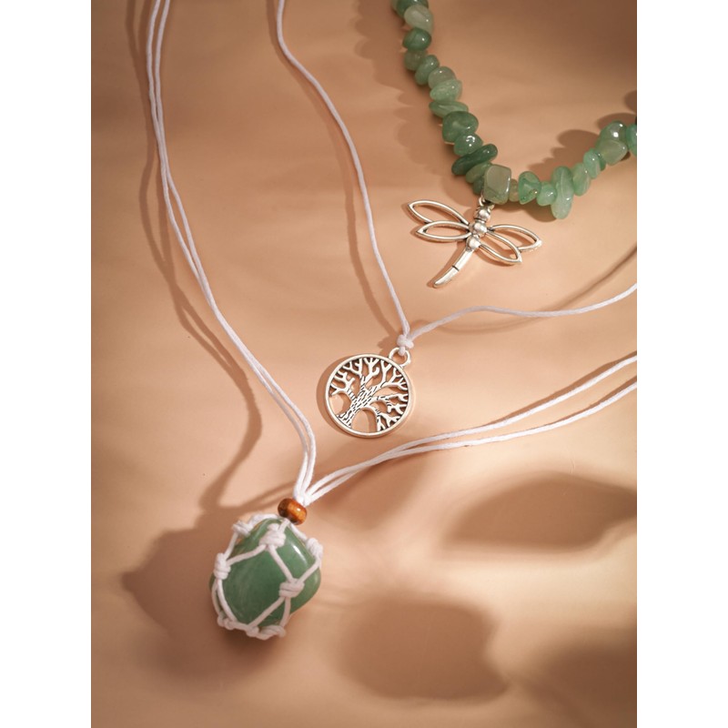 MINACHI Hippie Layered Necklace with Green Beads, Dragonfly & Tree of Life Charms, Boho Adjustable Jewelry For Women