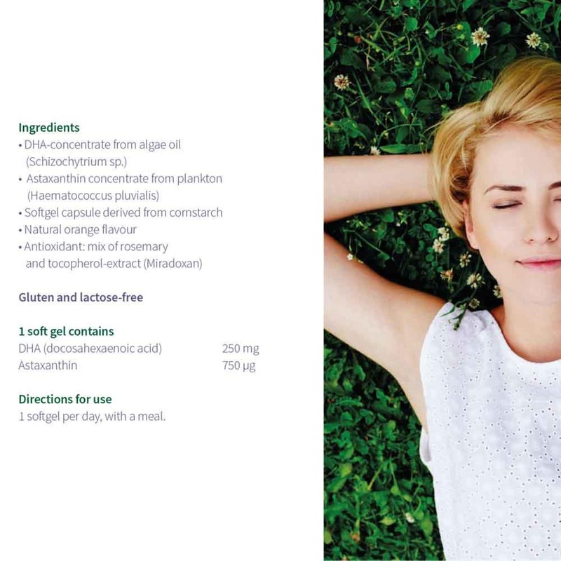 Algae oil DHA concentrate (from Schizochytrium sp.), humectants: glycerine and carrageenan, modified corn starch, natural orange flavouring, astaxanthin concentrate (from Haematococcus pluvialis), antioxidant: a mix of rosemary and tocopherol rich extract (Miradoxan), acidity regulator: sodium carbonate.