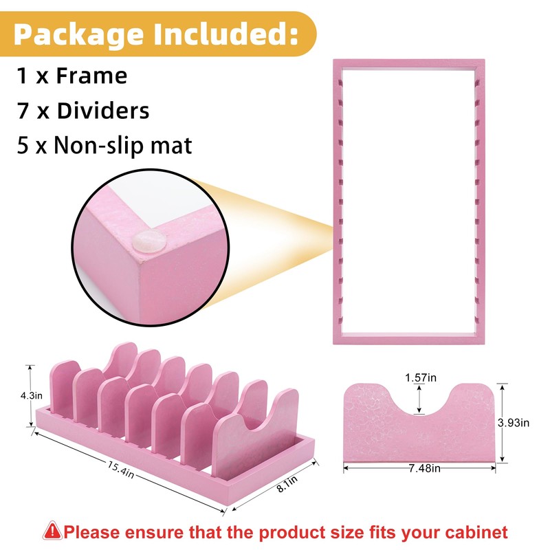 - Easy to Install:No extra tools required. Simply insert the divider into the slot. It also comes with non-slip silicone pads to protect your surfaces and prevent slipping. The non-slip mat is very stable, so you can put it on the cabinet or some other high places with more confidence, so that you can use it more at ease