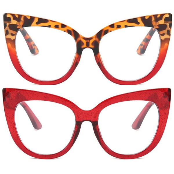 mincl Cat Eye Reading Glasses for Women,Retro Red Frame 2pack Computer Readers, Oversized Blue light Blocking Eyeglasses, (2pcs-red&leopard, 2.0, multiplier_x)