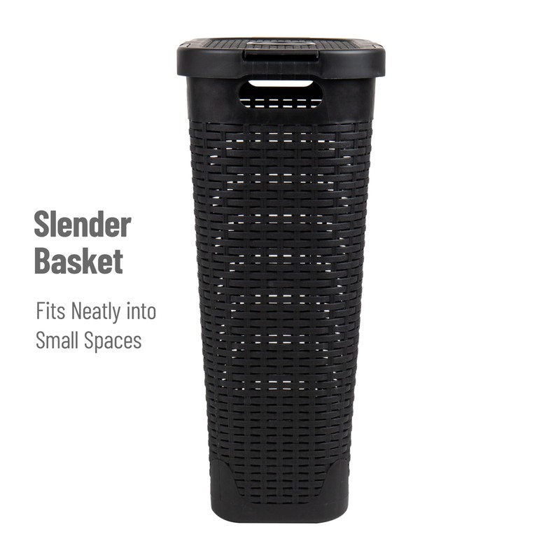 Mind Reader 40L Slim Laundry Hamper, Clothes Basket, Lid, Wicker Design, Plastic, 18"L x 10.4"W x 23.5"H, Set of 3, Black