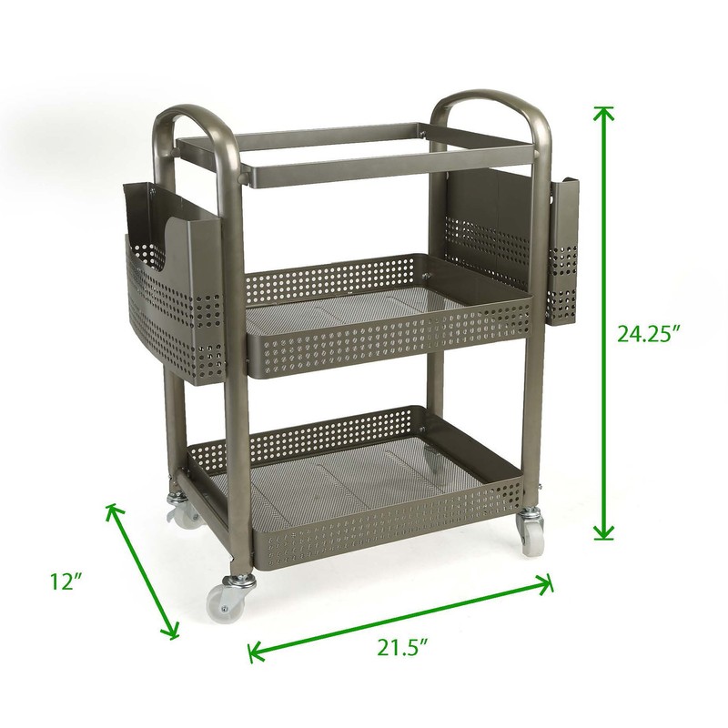 - DIMENSIONS - 12″ L x 21.5″ W x 24.25″ H.BASKET BUSINESS - Metal baskets with circular cutouts provide ample space for storing or serving office supplies, toys, makeup supplies, fitness gear, etc. while still allowing you to clearly view what's in each basket.MULTI-PURPOSE USE - This all-purpose rolling cart is so versatile, you can use it at the office for storing mail, documents, and other important supplies, or around the home to store makeup supplies, bathroom products, in your laundry room, in the kitchen, in kids' playrooms