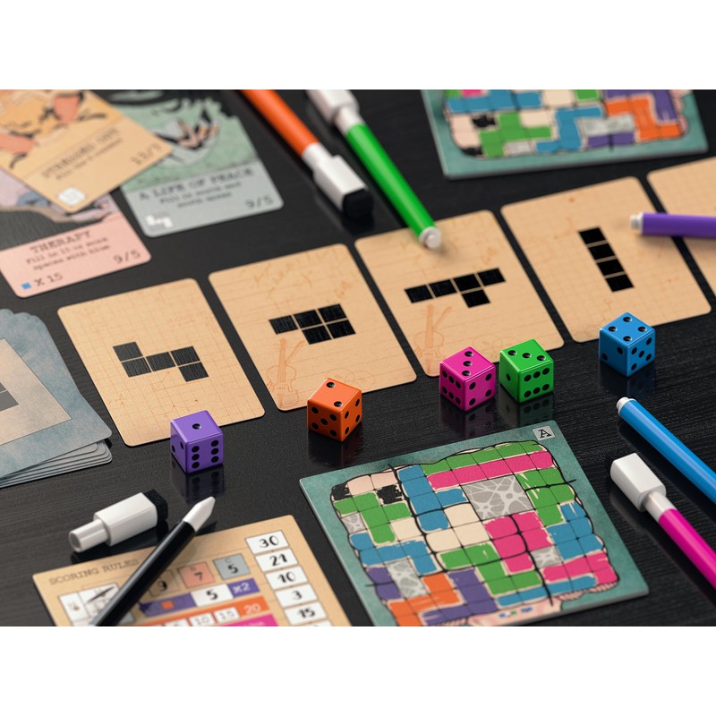 How do you fit all that “stuff” in your head? How do you organize it in a fun and fulfilling way, without it being stressful? The dice (much like life) are going to throw things at you, but you arrange your pursuits and priorities (polyominos) in your brain.