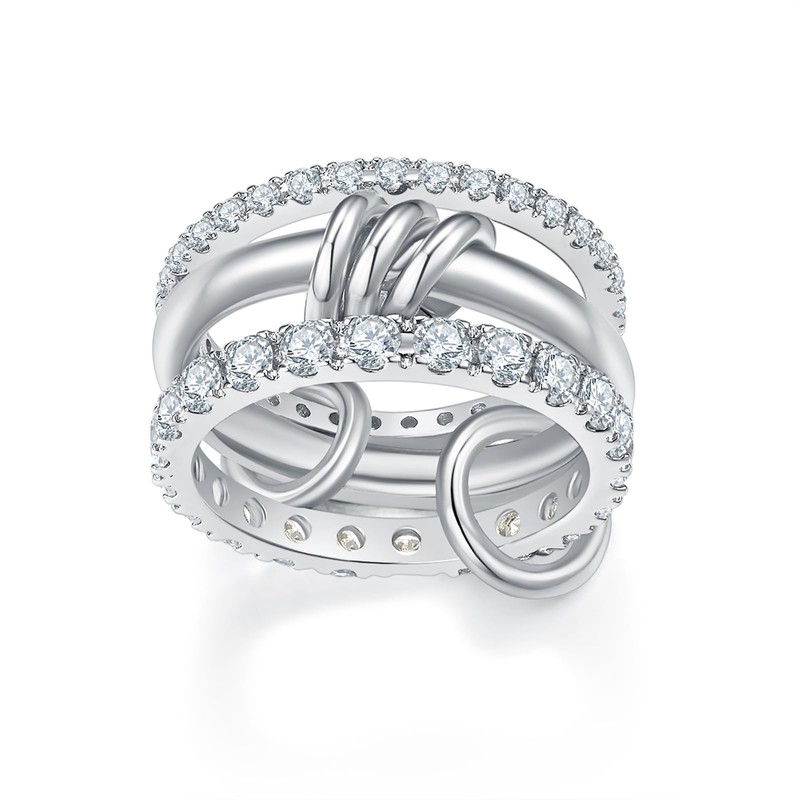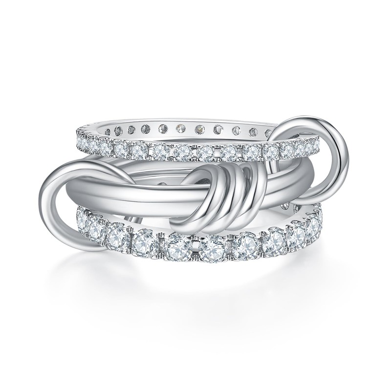• Elegant Knot Design – Features a unique interwoven knot center symbolizing connection and strength, paired with sleek bands for a chic layered look. Designed for stacking or separating. We linked three 2mm wide bands and added a touch of sparkle with premium cubic zirconia stones