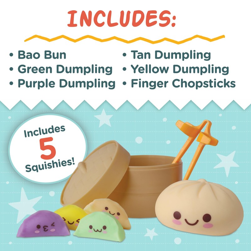 • Includes: bao bun squishy, green dumpling squishy, purple dumpling squishy, tan dumpling squishy, yellow dumpling squishy and finger chopsticks (Ages 5 and up)