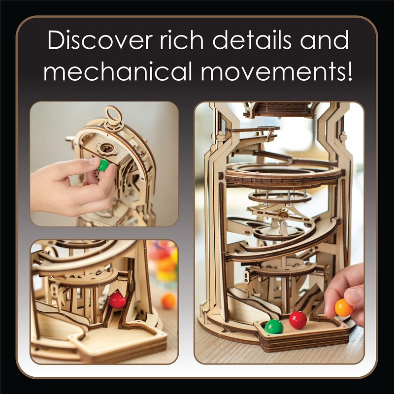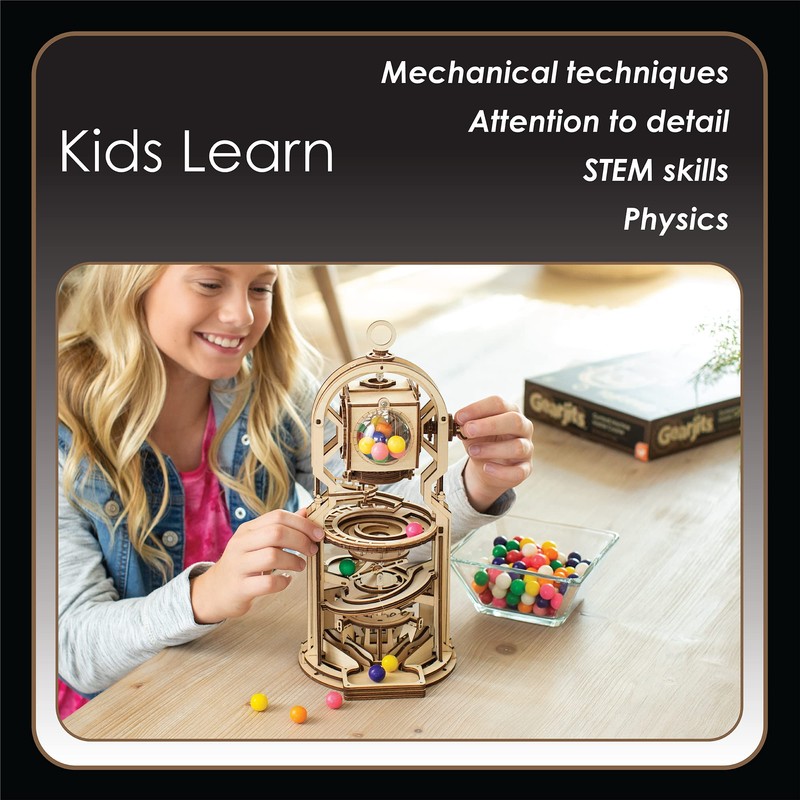- 3D Wooden Puzzles for Adults and Kids: Build a 12.75” x 6.5” x 6” marble run wooden gumball machine for kids and adults from beautiful, laser-cut wood pieces, with no glue and no tools; pieces slot together to make a sturdy finished model