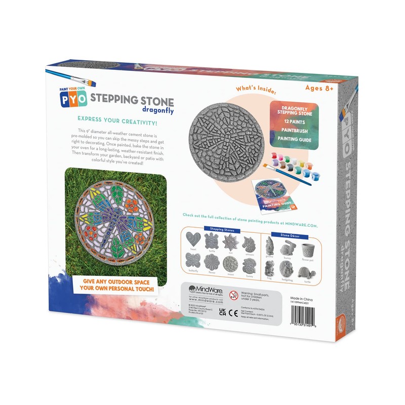 - Includes a 9" diameter cement dragonfly stepping stone, 12 paints, a paint brush and instructions.