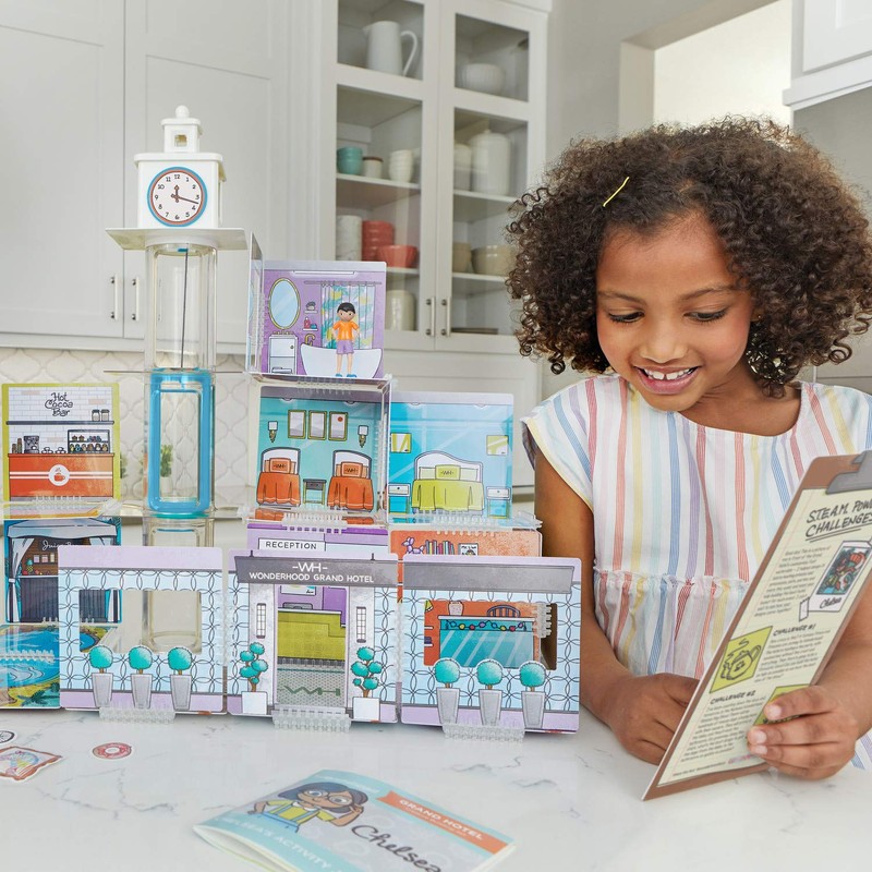 - TOYS THAT TEACH: Grand Hotel allows kids to build their own custom hotel or dreamhouse, with colorful bedrooms, a pool and a working elevator! Challenges are included to inspire building their creations in ways that problem solve!