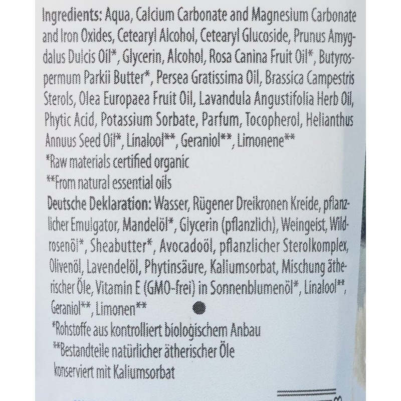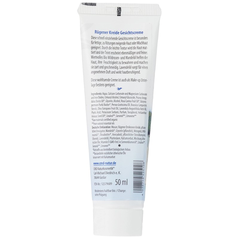 A true natural talent is the intense, yet light Rügener chalk face cream. Thanks to the natural powder effect of the Rügener chalk, the shine of the skin is prevented and the complexion looks more even and fine. Almond and wild rose oil organic also preserve the moisture content of the skin and make it soft and supple. A hint of precious lavender oil also soothes your skin. This product is 100% vegan. Complies with certified natural cosmetics guidelines. Contents: 50 ml ingredients: Aqua, Cetearyl alcohol, Cetearyl glucoside, Calcium Carbonate and Magnesium Carbonate and Iron Oxides, Prunus Amygdalus Dulcis Oil*, Glycerin, Rosa Canina Oil*, Butyrospermum Parkii Butter*, Alcohol, Persea Free Oil, Phytosterols, Olea Europa A Fruit Oil, Phytic Acid, Potassium Sorbate, Perfume, Tocopherol, Helianthus Annuus Seed Oil*, Aroma (*Raw materials certified organic) Contains: Linalool, Geraniol German declaration: water, vegetable emulsifier, Rügener tri-chalk, almond oil*, glycerine (vegetable), wild rose oil*, shea butter. *, Alcohol, Av. ocadin, phytic acid, potassium sorbate, blend of essential oils, vitamin E (GMO-free) in sunflower oil*, natural aroma (*raw materials from controlled organic cultivation) components of essential oils: linalool, geraniol preserved with potassium sorbate