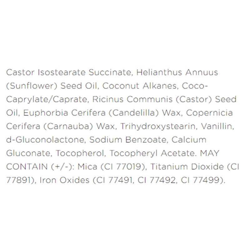 Castor Isostearate Succinate, Helianthus Annuus (Sunflower) Seed Oil, Coconut Alkanes, Coco-Caprylate/Caprate, Ricinus Communis (Castor) Seed Oil, Euphorbia Cerifera (Candelilla) Wax, \ Copernicia Cerifera (Carnauba) Wax, Trihydroxystearin, Vanillin, d-Gluconolactone, Sodium Benzoate, Calcium Gluconate, Tocopherol, Tocopheryl Acetate.