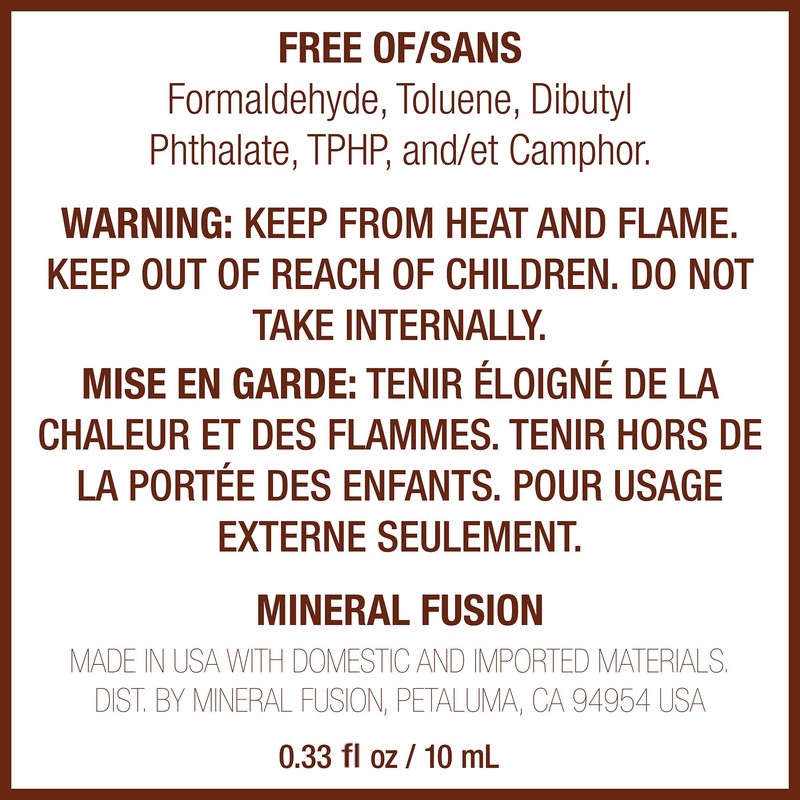 - Feel Good Formula: Offered in 64 beautiful shades, Mineral Fusion nail polish is 100 percent vegan and does not include toluene, camphor, DBP, or formaldehyde. Cruelty-free and certified carbon-free