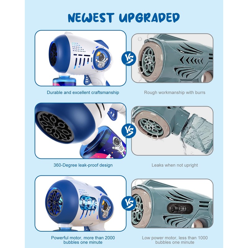 - 【Cool LED Lights】Making the bubbles glow in dark and adding tons of fun to the kids bubble games night.Spaceship shaped bubble gun also can make kids happier in playing.