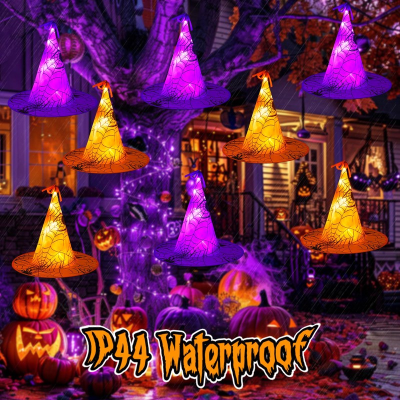 - Hallowee Decorration Lights: 56 LED halloween string lights with 8 witch hats(4pcs orange hat with orange lights,4pcs purple hat with purple lights), amazing match for the haunted stuff like spider web, bats, pumpkin, ghost, skeleton, skull, fun for kids and enlivening the holiday atmosphere, a grace present for family, friends, relatives, colleagues, teenage or yourself in this festival season