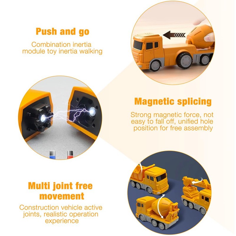 - Magnetic transformer toy for children: construction site vehicles car toy set offers a unique and exciting playing experience thanks to magnetic parts, so children can assemble and disassemble their own cars, trucks, forklifts and even robots. Magnetic toys for children 26 vehicles or parts can let children run wild to create their own robots, and they will give new surprises when they try new combinations.